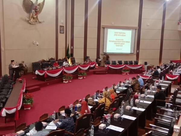Medan, POL | DPRD Kota Medan menggelar sidang paripurna penyampaian pokok pikiran (Pokir) yang dihadiri Sekretaris Daerah Kota Medan, Wirya Al Rahman mewakili Pelaksana Tugas (Plt) Wali Kota Medan, Akhyar Nasution di gedung dewan, Senin (9/3/2020).