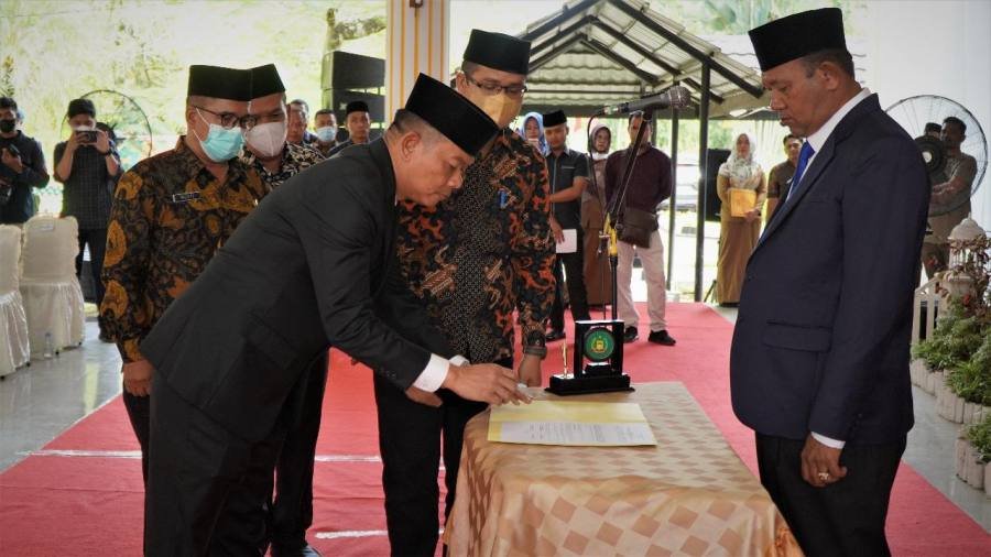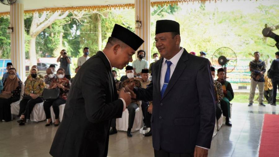 Pelaksana Tugas (Plt) Bupati Langkat H Syah Afandin SH melantik dan mengambil sumpah jabatan Amril SSos MAP sebagai Sekretaris Daerah Kabupaten (Sekdakab) Langkat, di Pendopo Jentera Malay Rumah Dinas Bupati Langkat, Stabat, Jumat (5/8/2022).