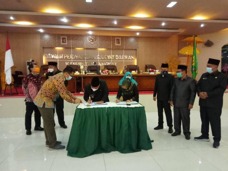 Penandatanganan dilakukan pada rapat paripurna DPRD Langkat, diikuti para wakil ketua DPRD Langkat Ralin Sinulingga, Antoni Ginting dan Donny Setha. Disaksikan segenap anggota DPRD Langkat, Wakil Bupati Langkat H. Syah Afandin, Kapolres Langkat AKBP Danu Pamungkas Totok, SH, SIK, Sekdakab Langkat dr H. Indra Salahuddin, unsur Forkopimda Langkat, para pejabat Pemkab Langkat dan tamu undangan lainnya.
