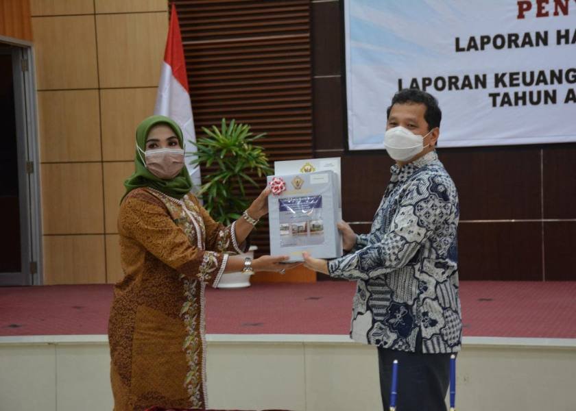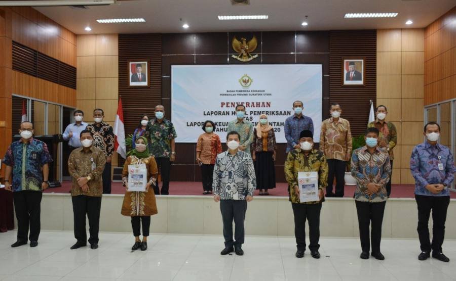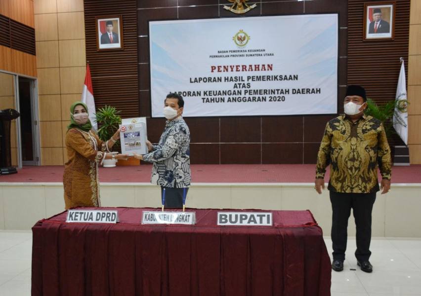 Predikat Opini WTP ditandai penyerahan berkas hasil pemeriksaan kepada Bupati Langkat Terbit Rencana PA oleh ketua BPK Perwakilan Sumut Eydu Oktain Panjaitan, pada acara penyerahan hasil pemeriksaan atas laporan keuangan pemerintah daerah tahun anggaran 2020, di Gedung BPK RI Perwakilan Sumut, Kota Medan, Selasa (25/5/2021).