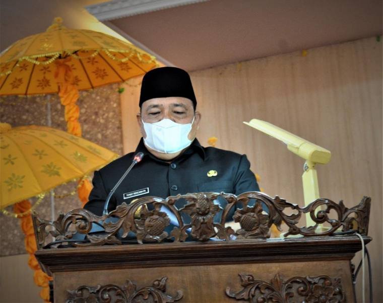 Langkat, POL | Bupati Langkat Terbit Rencana PA didampingi Wakilnya H. Syah Afandin menyampaikan penjelasan  Ranperda APBD Kabupaten Langkat Tahun Anggaran (TA) 2020 pada rapat Paripurna DPRD Langkat, di Gedung DPRD Langkat, Stabat, Kamis (1/7/2021).