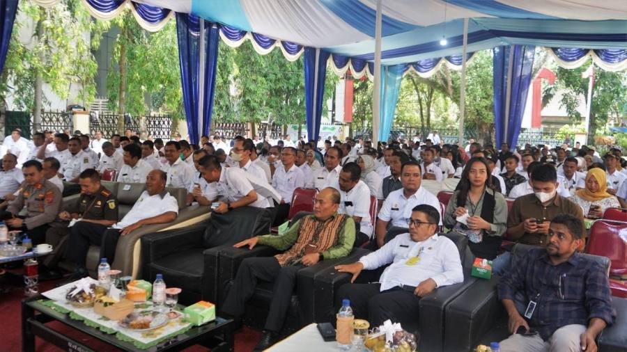 Pelaksana Tugas (Plt) Bupati Langkat H Syah Afandin SH serahkan penghargaan kepada capaian realisasi target pendapatan asli daerah (PAD) Kabupaten Langkat 2021, di Halaman Kantor Bapenda Langkat, Stabat, Rabu (21/9/2022).