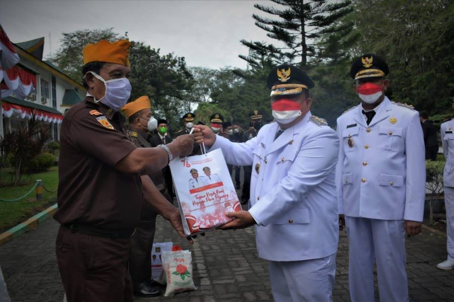 Usai bertindak sebagai Inspektur Upacara (Irup), Bupati Langkat menyerahkan bingkisan kemerdekaan kepada 90 Legiun Veteran Republik Indonesia (LVRI) Langkat. Diserahkan secara simbolis kepada 4 orang perwakilan LVRI.