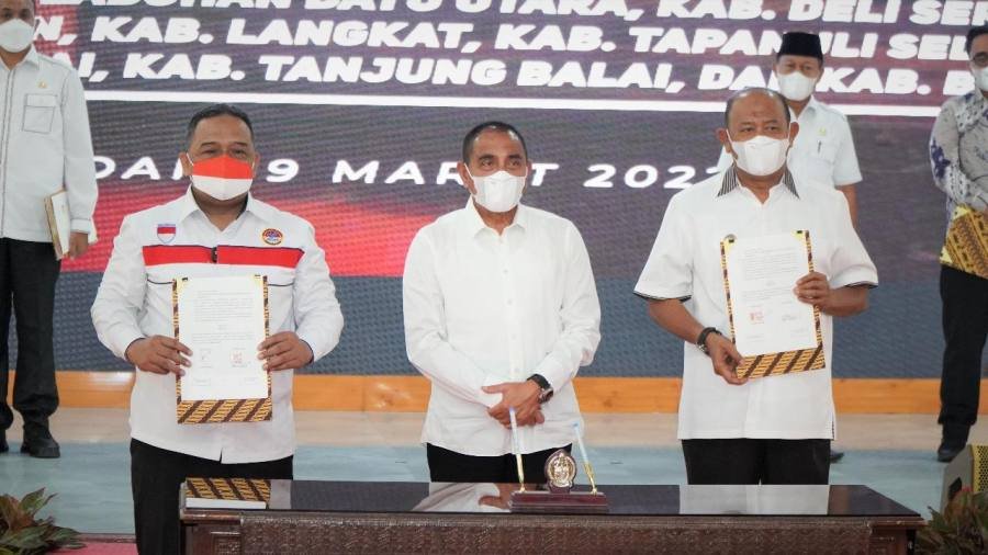 Teken dilakukan Pelaksana tugas Bupati Langkat H Syah Afandin SH bersama Kepala BP2MI Benny Rhamdani disaksikan Gubernur Sumatera Utara Edy Rahmayadi, di Aula T. Rizal Nurdin Rumah Dinas Gubernur Sumatera Utara, Medan, Rabu (9/3/2022).