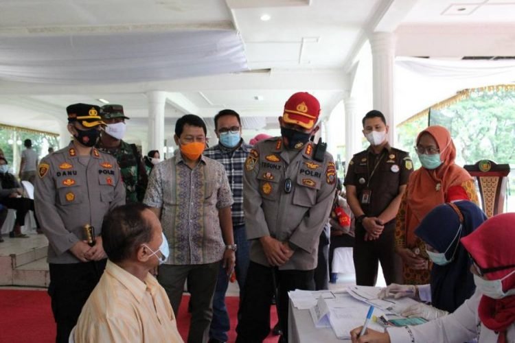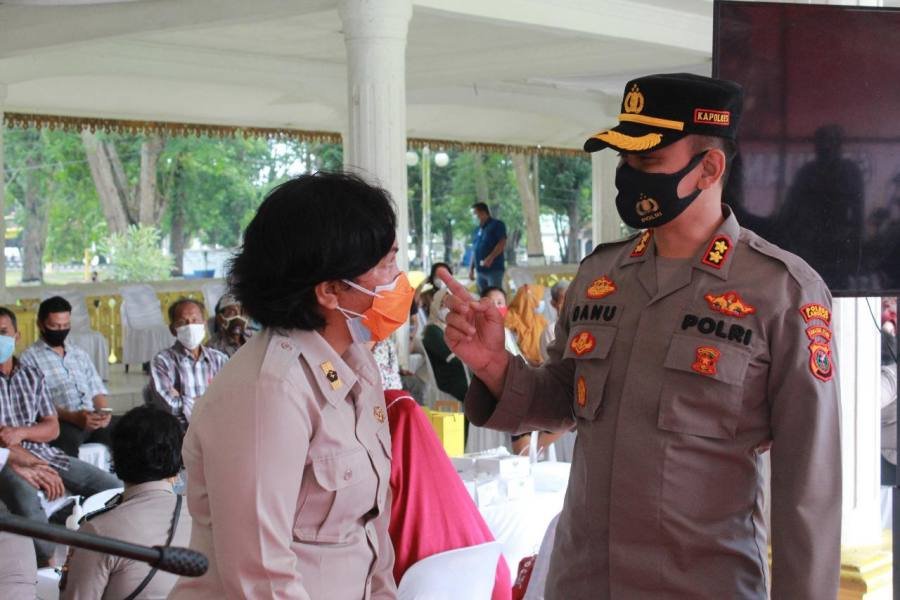 Langkat, POL | Polres dan Pemkab Langkat bekerjasama melaksanakan serbu vaksinasi massal dalam rangka HUT ke-75 Bhayangkara di tahun 2021, bertempat di Tribun Alun-alun T. Amir Hamzah Stabat serta tersebar di 20 Kecamatan Wilkum Polres Langkat, Sabtu (26/6/2021).