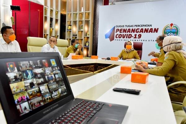 Medan, POL | Sekretaris Daerah Provinsi (Sekdaprov) Sumatera Utara (Sumut) R Sabrina mengikuti video conference Menteri Dalam Negeri (Mendagri) Tito...