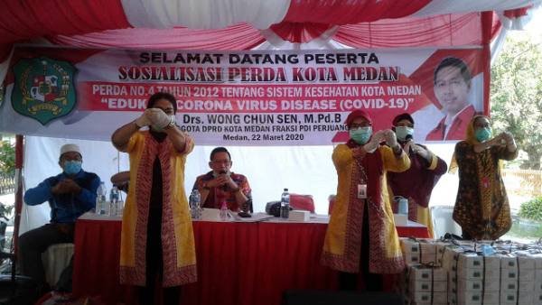 Medan, POL | Anggota DPRD Medan Wong Chun Sen membagi- bagikan masker kepada dua ratus warga saat melaksanakan sosialisasi Perda...