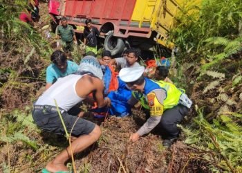 Tapteng, POL | Mobil truk bernomor polisi BB 8681 YA dengan muatan batu bata masuk jurang di Jalan Rampa-Poriaha, Kecamatan...