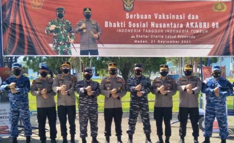 Medan, POL | Alumni Akademi Angkatan Bersenjata Republik Indonesia (AKABRI) Tahun 1998 menggelar vaksinasi covid-19 massal di Lanud Soewondo, Medan, Selasa (21/9).