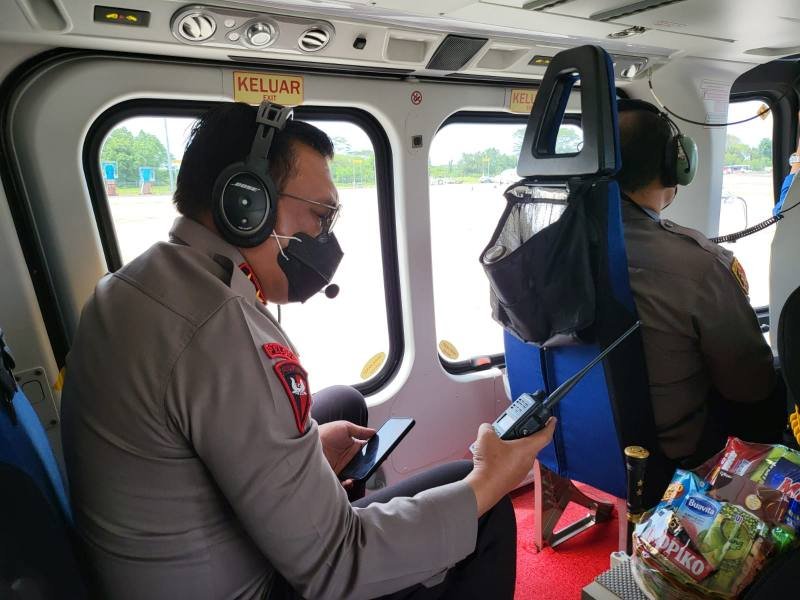 Dengan menggunakan Helikopter, Kapolda Sumut bersama para pejabat utama meninjau lokasi kebakaran hutan dari udara dan tiba di Lapangan SMP Negeri 1 Sianjur Mula-Mula Desa Sarimarihit Kec.Sianjur Mula-Mula Kab.Samosir.