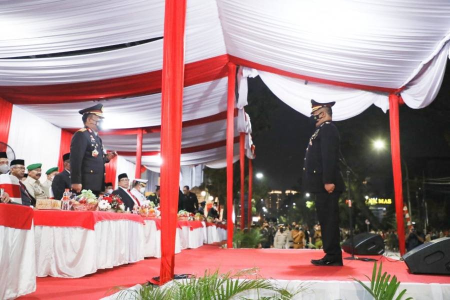 Medan, POL | Dalam rangka memperingati HUT RI ke 77 tahun 2022, ratusan peserta yang terdiri dari pelajar, personil TNI-Polri, Aparatur Sipil Negara (ASN) dari sejumlah instansi mengikuti upacara Taptu yang digelar di didepan kantor Gubernur Sumatera Utara, Selasa (16/8/2022) sekira pukul 20.00 wib