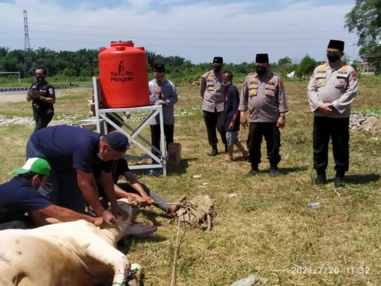 Medan, POL |  Polda Sumatera Utara di Hari Raya Idul Adha ini melaksanakan penyembelihan dan menyumbangkan sapi untuk kurban sebanyak 43 ekor sapi, 20 ekor sapi disembelih di Mapolda Sumatera Utara dan 23 ekor sapi lainnya disumbangkan ke Yayasan Panti Asuhan dan Pesantren, Selasa (20/07/2021).