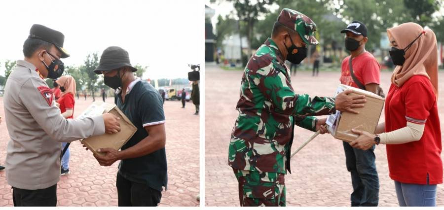 Penyerahan paket bantuan sosial (bansos) diberikan langsung Kapolda Sumut Irjen Pol RZ Panca Putra Simanjuntak bersama Pangdam I/BB Mayjen TNI Hasanuddin, secara simbolis kepada masyarakat serta pekerja yang terdampak PPKM Darurat, Jumat (16/7).