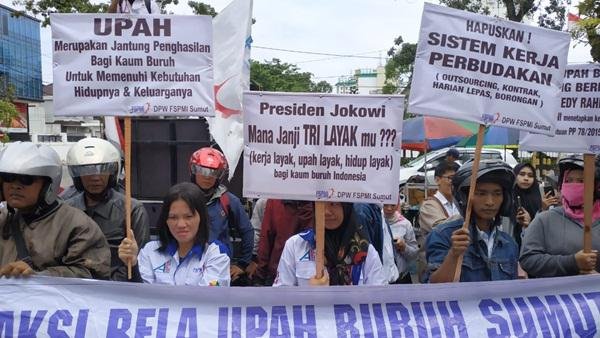 selengkapnya>Medan, perjuanganonline | Kantor Gubernur Sumatera Utara digeruduk buruh dari Federasi Serikat Pekerja Metal Indonesia (FSPMI), Senin (5/11/2018). Massa yang...