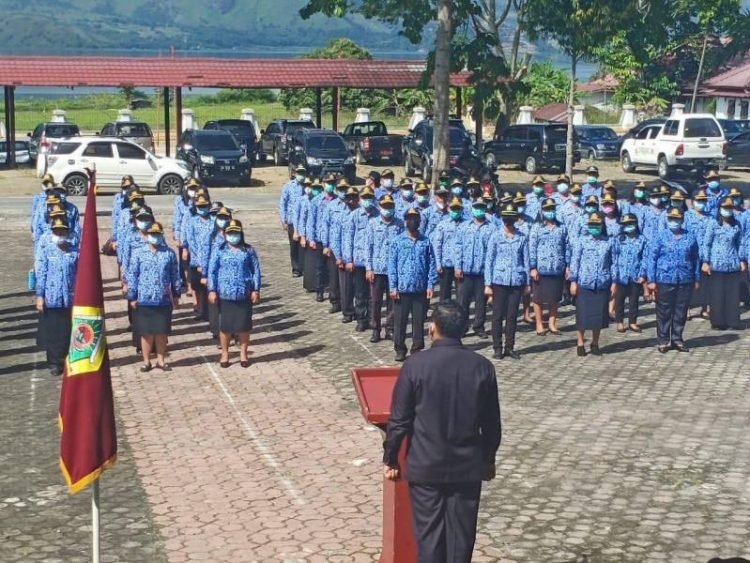 Samosir, POL | Bertempat di Lapangan Sekretariat Pemkab Samosir, sebanyak 202 orang CPNS di lingkungan Pemerintah Kabupaten Samosir mengambil sumpah dan janji menjadi PNS daerah Kabupaten Samosir formasi umum T.A 2018 dihadapan Bupati Drs. Rapidin Simbolon, MM, Senin (08/02/2021).