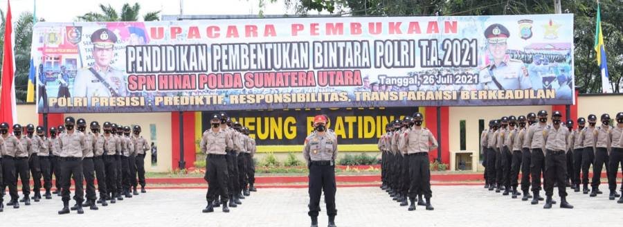 Medan, POL | Kapolda Sumut Irjen Pol Drs. Panca Putra Simanjuntak, MSi memipin Upacara Pembukaan Pendidikan Pembentukan Bintara Polri T.A. 2021, Senin (26/07/21) pukul 10.25 WiIB bertempat di SPN Hinai Polda Sumut.