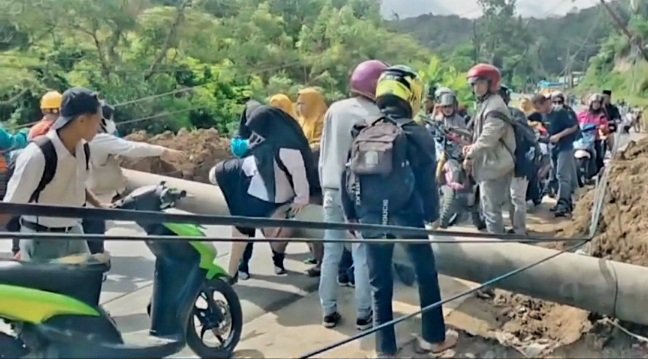 Pantauan di lokasi, tiang beton sepanjang sekitar 15 meter itu melintang di badan jalan, menyulitkan kendaraan roda dua dan empat untuk melintas. Sebagian pengendara sepeda motor terpaksa menggotong kendaraan mereka secara bergotong royong agar bisa melewati titik longsor.