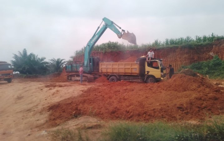 Terlihat satu unit alat berat ekskavator sedang mengeruk tanah dan mengisinya ke mobil dumptruck yang terlihat mengantri untuk memuat tanah hasil galian di lokasi tersebut.
