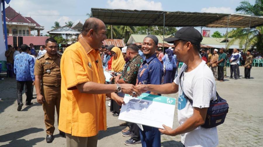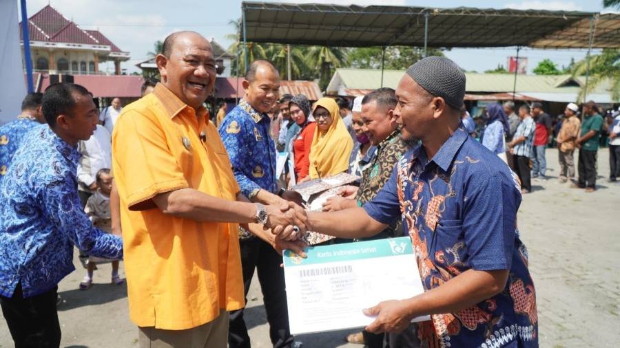 Selain itu, Syah Afandin juga menyerahkan secara simbolis Kartu Indonesia Sehat (KIS) Jaminan Kesehatan Nasional Penerima Bantuan Iuran (PBI-JKN) se kecamatan Langkat Hulu dari Dinas Sosial.