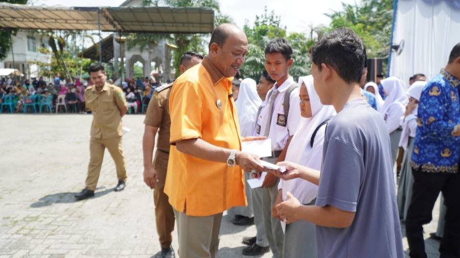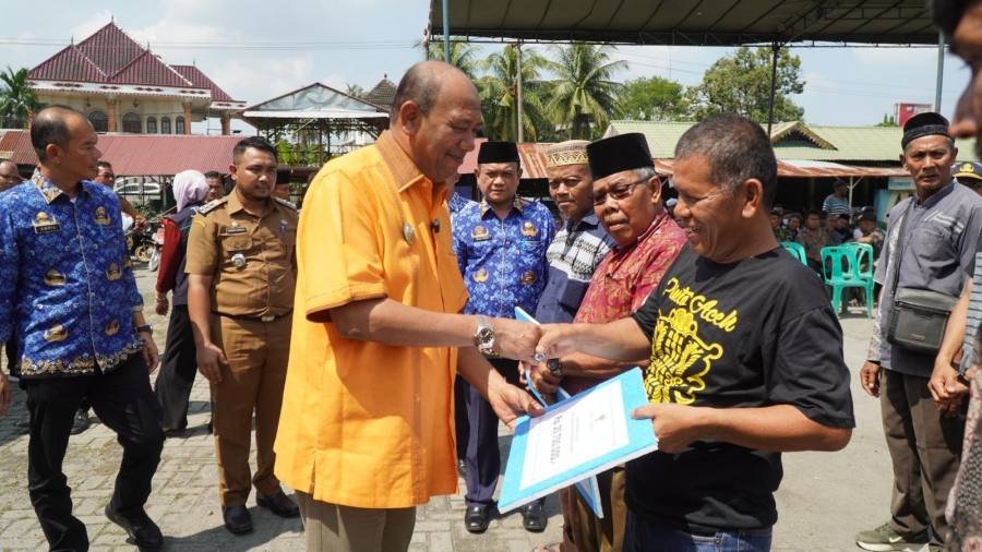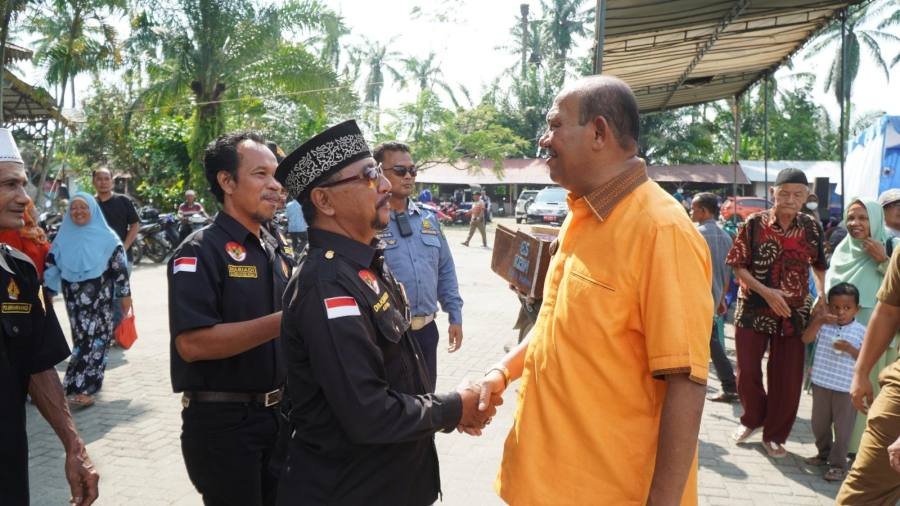 Plt Bupati Langkat H.Syah Afandin, SH menyerahkan Bantuan Sosial (Bansos) Bilal Mayit, Penggali Kubur dan Abang Becak wilayah Langkat Hulu, bertempat di Kecamatan Selesai, Langkat Kamis 18 September 2023.