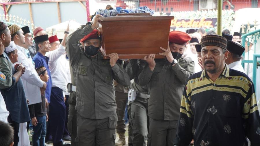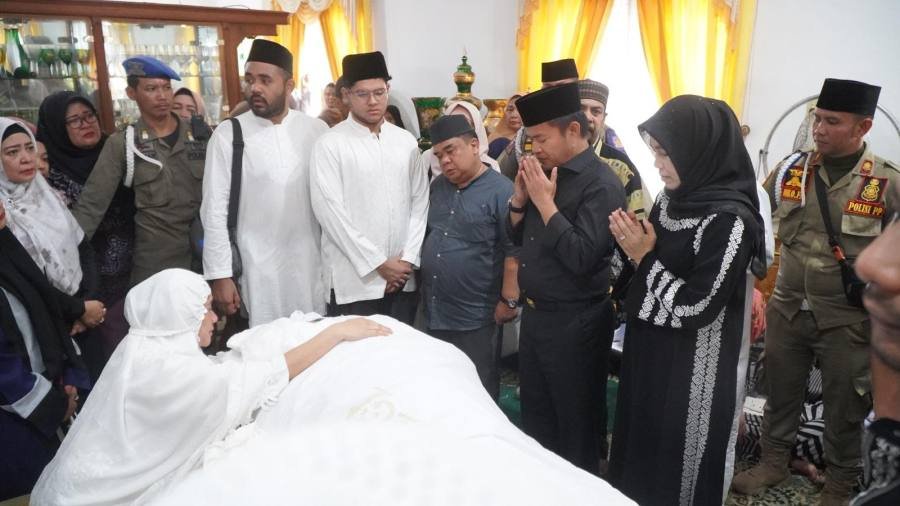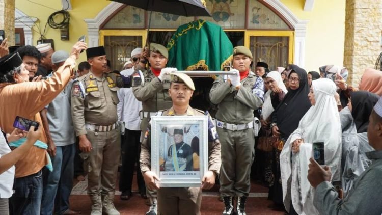 Plt Bupati Langkat H.Syah Afandin, SH menyambut kedatangan jenazah Almarhum Dato’ Seri H.Syamsul Arifin, SE bin Hasan Basri tiba di rumah duka Jalan Stasiun Kelurahan Berandan Timur Baru Kecamatan Babalan, Rabu (18/10/2023).