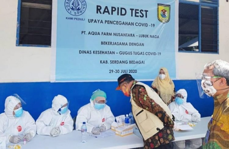 Pantai Cermin, POL | Bupati Serdang Bedagai (Sergai) Ir. H. Soekirman menghadiri kegiatan rapid test terhadap 2.200 karyawan PT Aqua Farm Nusantara yang dilaksanakan di lokasi perusahaan di Desa Sei Nagalawan Kecamatan Pantai Cermin, Kamis (30/07/2020).