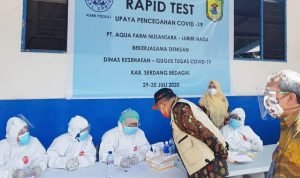 Pantai Cermin, POL | Bupati Serdang Bedagai (Sergai) Ir. H. Soekirman menghadiri kegiatan rapid test terhadap 2.200 karyawan PT Aqua Farm Nusantara yang dilaksanakan di lokasi perusahaan di Desa Sei Nagalawan Kecamatan Pantai Cermin, Kamis (30/07/2020).