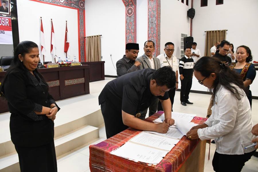 Persetujuan bersama ditandai dengan penandatangan oleh Bupati Samosir dengan Ketua DPRD, Sorta E. Siahaan, Wakil Ketua DPRD Pantas M. Siahaan dan Nasib Simbolon di Gedung DPRD Kabupaten Samosir, Selasa (22/11/2023).