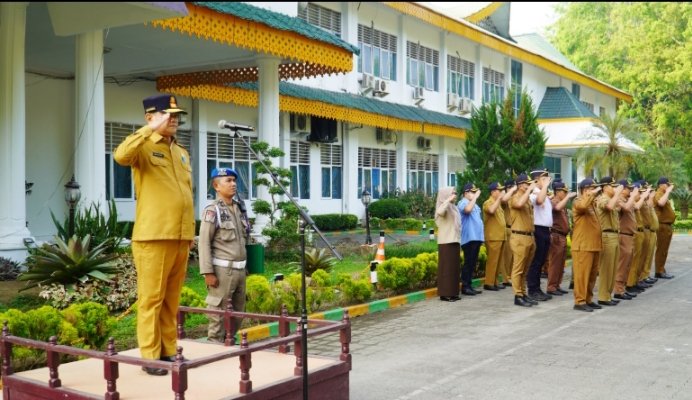 Stabat, POL | Pj.Bupati Langkat H.M.Faisal Hasrimy,AP,M.AP di wakili Asisten pemerintah dan kesejahteraan rakyat Drs. H. Mulyono, M.Si menjadi pembina apel gabungan di jajaran pemerintah Kabupaten Langkat di halaman Kantor Bupati Langkat, Senin (25/03/2024).
