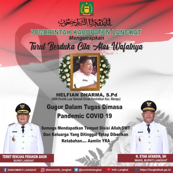 Langkat, POL | Kembali berkabung, Bupati Langkat Terbit Rencana PA menyampaikan bela sungkawa, atas meninggalnya Aparatur Sipil Negara (ASN) Pemerintah Kabuapaten Langkat, Helfian Dharma (52), akibat positif terinfeksi covid 19 pada Minggu 13 September 2020.
