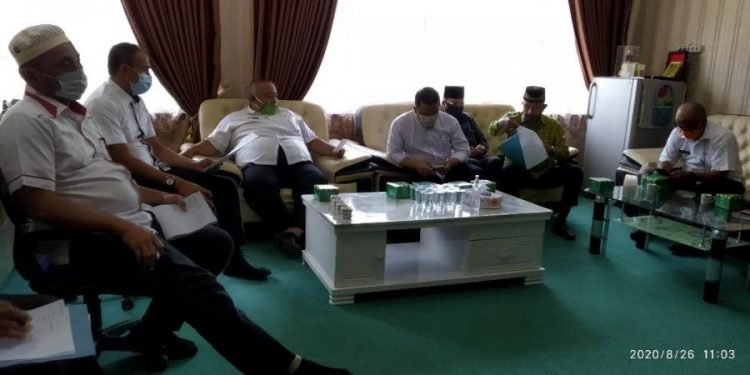 Stabat, POL | Lembaga Pengembangan Tilawatil Quran (LPTQ) Provinsi Sumatera Utara audensi ke Pemerintah Kabupaten Langkat, diterima Bupati Langkat Terbit Rencana PA melalui Asisten II Ekbangsos H.Hermasyah, di Ruang Rapat Asisten II Kantor Bupati Langkat, Stabat, Rabu (26/8/2020).