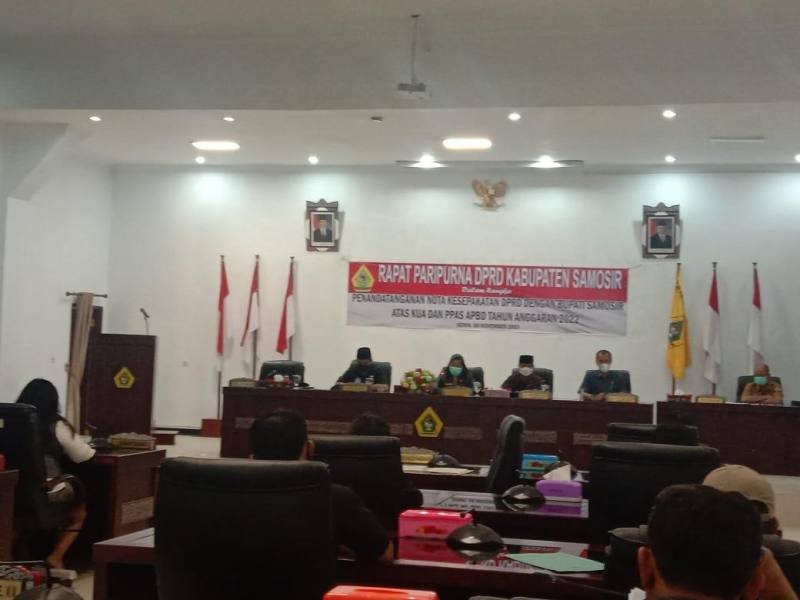 Samosir, POL | DPRD Kabupaten Samosir kembali menggelar rapat paripurna dengan agenda penandatanganan nota kesepakatan DPRD dengan Bupati Samosir atas Kebijakan Umum Anggaran (KUA) dan Prioritas dan Plafon Anggaran Sementara (PPAS) APBD Tahun Anggaran 2022, Senin ( 8/11/2021).