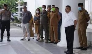 Didampingi kadis kesehatan H Kamal Ilham, SKM,Mkes Kadiskominfo Rajid Yuliawan, S.Kom, Kaban BPBD Atya Muktar dan Kasatpol PP M.Yunus. SH, Sekdakab menyaksikan tim pengamanan penjemputan Vaksin ke Dinas Kesehatan Provinsi Sumatera Utara. (POL/LB1)