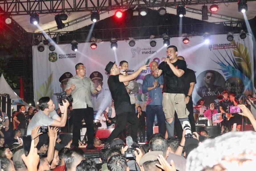 Medan, POL | Panggung hiburan perayaan HUT ke-432 Kota Medan, Jumat (1/7) malam yang menampilkan artis ibu kota benar-benar pecah dan meriah. Wali Kota Medan Bobby Nasution bersama masyarakat menyaksikan penampilan spektakuler Indah Nevertari, Alvin Habib, Ihsan Tarore, Budi Doremi, Judika, dan Tipe X di atas panggung yang didirikan di Jalan Balai Kota, persimpangan Jalan Raden Saleh. Kerinduan pada suasana konser yang tertunda selama dua tahun terakhir ini akibat pandemi Covid-19 pun terpuaskan.
