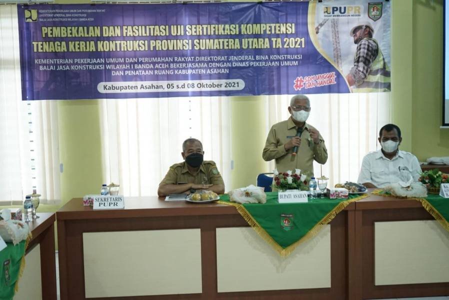 Hal itu disampaikan Bupati H. Surya BSc ketika membuka pelaksanaan kegiatan pembekalan dan fasilitasi uji sertifikasi kompetensi tenaga kerja konstruksi kerja sama Dinas PUPR Kabupaten Asahan dengan Balai Jasa Konstruksi Wilayah I Banda Aceh, bertempat di aula Dinas PUPR setempat, Selasa (05/10/2021).