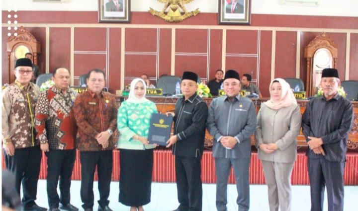 Labuhanbatu, POL | Bupati Labuhanbatu dr. Hj. Maya Hasmita Sp.OG. M.KM bersama pimpinan DPRD Labuhanbatu menandatangani nota Kesepakatan Kebijakan Umum Anggaran (KUA), Rancangan Prioritas dan Plafon Anggaran Sementara (PPAS) APBD Kabupaten Labuhanbatu TA 2026, di Ruang Rapat Paripurna DPRD Labuhanbatu, Jalan SM Raja, Kecamatan Rantau Selatan. Jumat (7/11/2025). Rapat paripurna tersebut dipimpin langsung ketua DPRD Labuhanbatu Arjan Priadi Ritonga.