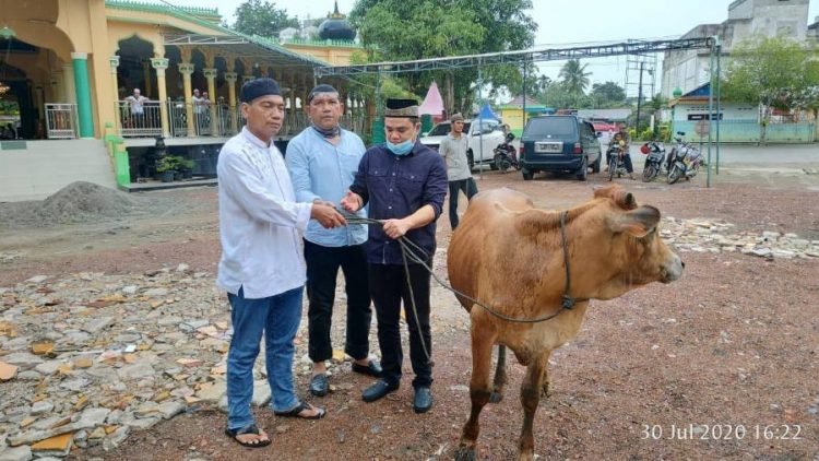 Penyerahan sapi qurban, secara simbolis diserahkan melalui Herman Harahap kepada ketua BKM Masjid Raya Stabat, T. M. Benyamin dengan memberikan 1 ekor sapi di halaman Masjid Raya Stabat, Langkat, Kamis (30/7/2020).