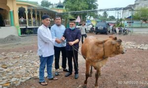 Penyerahan sapi qurban, secara simbolis diserahkan melalui Herman Harahap kepada ketua BKM Masjid Raya Stabat, T. M. Benyamin dengan memberikan 1 ekor sapi di halaman Masjid Raya Stabat, Langkat, Kamis (30/7/2020).