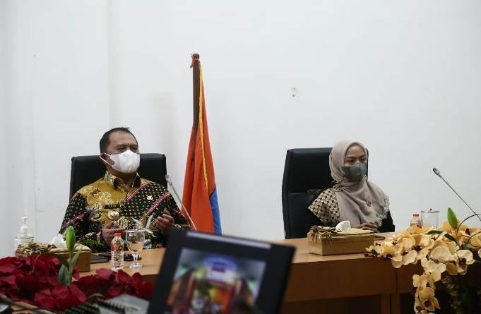 Labuhanbatu, POL | Bupati Labuhanbatu dr. H. Erik Adtrada Ritonga, MKM beserta Ketua Dekranasnada dr. Hj, Maya Hasmita SpOG mengikuti kegiatan Webinar dan Talkshow oleh Bank Indonesia (BI) secara daring di Ruang Rapat Kantor Bupati, Jalan SM Raja Rantauprapat, Selasa (05/10/2021).