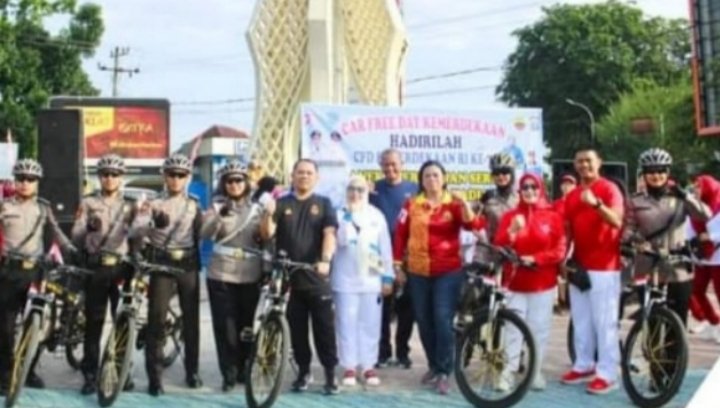 Labuhanbatu, POL I Bupati Labuhanbatu dr. H. Erik Adtrada Ritonga, MKM dan Wakil Bupati Hj. Ellya Rosa Siregar SPd, MM., mengikuti kegiatan Car Free Day Kemerdekaan di Bundaran Simpang Enam, Rantauprapat, Minggu (27/08/2023).