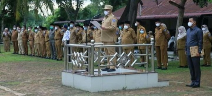 Rantauprapat, POL | Bupati Labuhanbatu dr.H.Erik Adtrada Ritonga, MKM bertindak sebagai Pembina Upacara pada apel gabungan Kelompok I, II, III, IV yang digelar di Halaman Gedung Diklat Badan Kepegawaian Pendidikan dan Pelatihan Daerah (BKPPD) Labuhanbatu, Senin (20/09/2021).