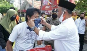 ”Alhamdulillah, hari ini kita bagikan 5000 masker kepada warga dan pengendara di simpang enam ini sekaligus sosialisasikan aturan denda disiplin terkait penggunaan masker,” kata Bupati Andi Suhaimi.