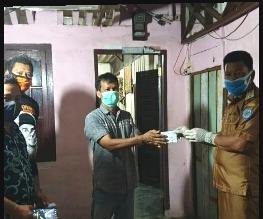 Teks Foto : Camat Rantau Utara Turing Ritonga saat menyerahkan uang santunan dari Bupati Labuhanbatu kepada keluarga IN korban terduga Covid-19. (POL)