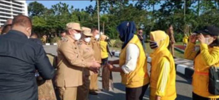 Labuhanbatu, POL | Bupati Labuhanbatu dr. H. Erik Adtrada Ritonga, M.KM dan Wakil Bupati Labuhanbatu Hj. Ellya Rosa Siregar, S.Pd, MM, menyapa dan bertemu ramah dengan petugas kebersihan penyapu jalan se-Rantauprapat di halaman Kantor Bupati jalan SM. Raja Rantauprapat, Senin (04/10/2021) pagi.