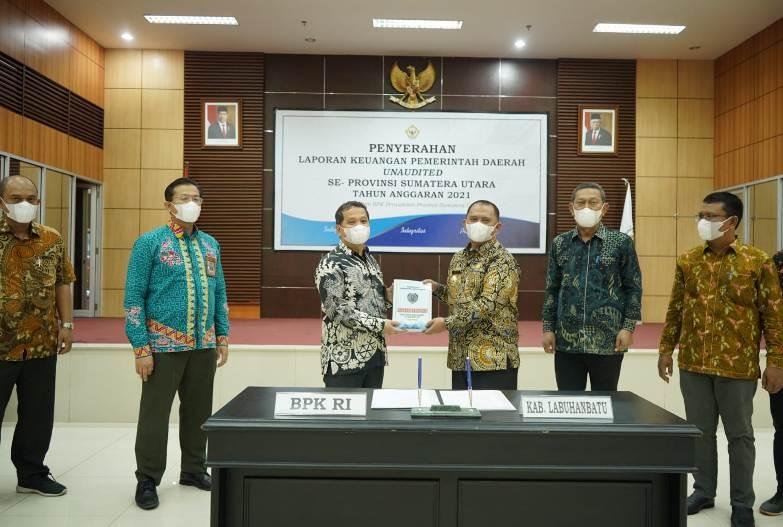 Labuhanbatu, POL | Bupati Labuhanbatu dr.H.Erik Adtrada Ritonga, MKM, menyerahkan Laporan Keuangan Pemerintah Daerah (LKPD) Un-Audited Tahun Anggaran 2021 di Gedung Badan Pemeriksa Keuangan (BPK) RI Perwakilan Sumatera Utara Jl. Imam Bonjol No.22, Madras Hulu, Kecamatan Medan Polonia, Kota Medan, Selasa (29/3/2022).
