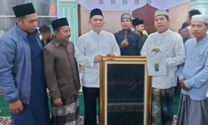 Di sela acara tersebut, Bupati Erik juga memberikan Cinderamata kepada Pengurus BKM Masjid Kampung Jawa Al Amin dan memberikan sumbangan Rp30 juta untuk pembangunan rumah Tahfiz.