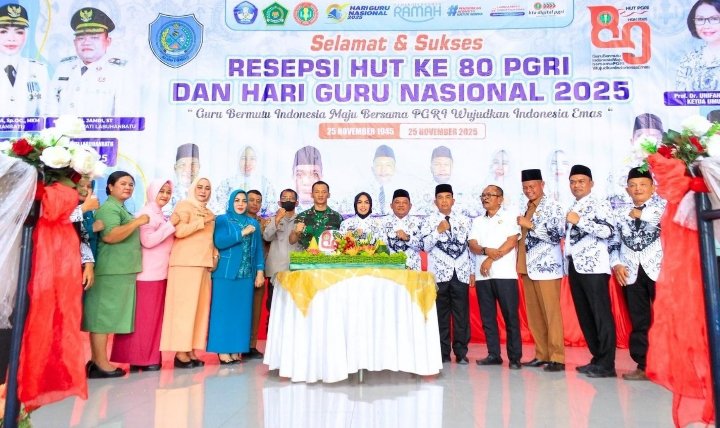 Labuhanbatu, POL | Resepsi Hari Ulang Tahun ke-80 Persatuan Guru Republik Indonesia (PGRI) dan Hari Guru Nasional Tahun 2025 berjalan dengan penuh khidmat dan semarak, Senin (8/12/2025). Acara berlangsung di gedung serbaguna, dihadiri Bupati Labuhanbatu, jajaran Forkopimda, para guru, kepala sekolah, serta pengurus PGRI se-Labuhanbatu.