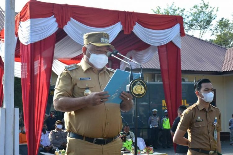Stabat, POL | Bupati Langkat Terbit Rencana PA memimpin apel pasukan Operasi Lilin Toba 2020 dalam pelaksanaan pengamanan Natal dan tahun baru 2021 di Wilayah Hukum (Wilkum) Polres Langkat, di Lapangan Januraga Polres Langkat, Stabat, Senin ( 21/12/20).