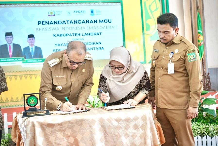 Stabat, POL | PJ. Bupati Langkat H. M. Faisal Hasrimy, AP., M.AP Tandatangani MoU dan Kerjasama dengan Yayasan Adihulung Pendidikan Nusantara untuk Program Beasiswa Indonesia Emas Daerah (BIE-D) dalam negeri dan luar negeri di Pendopo Jentera Malay Rumah Dinas Bupati, Selasa (04/06/2024) pagi.