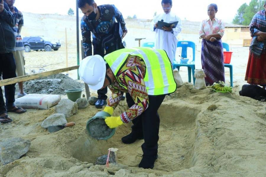 Samosir, POL | Bupati Samosir Vandiko T. Gultom, ST melakukan peletakan batu pertama pembangunan Gedung Olah Raga (GOR) Kabupaten Samosir di Lumban Sihombing, Dusun II Desa Hutanamora, Kecamatan Pangururan, Kamis (18/08/2022).